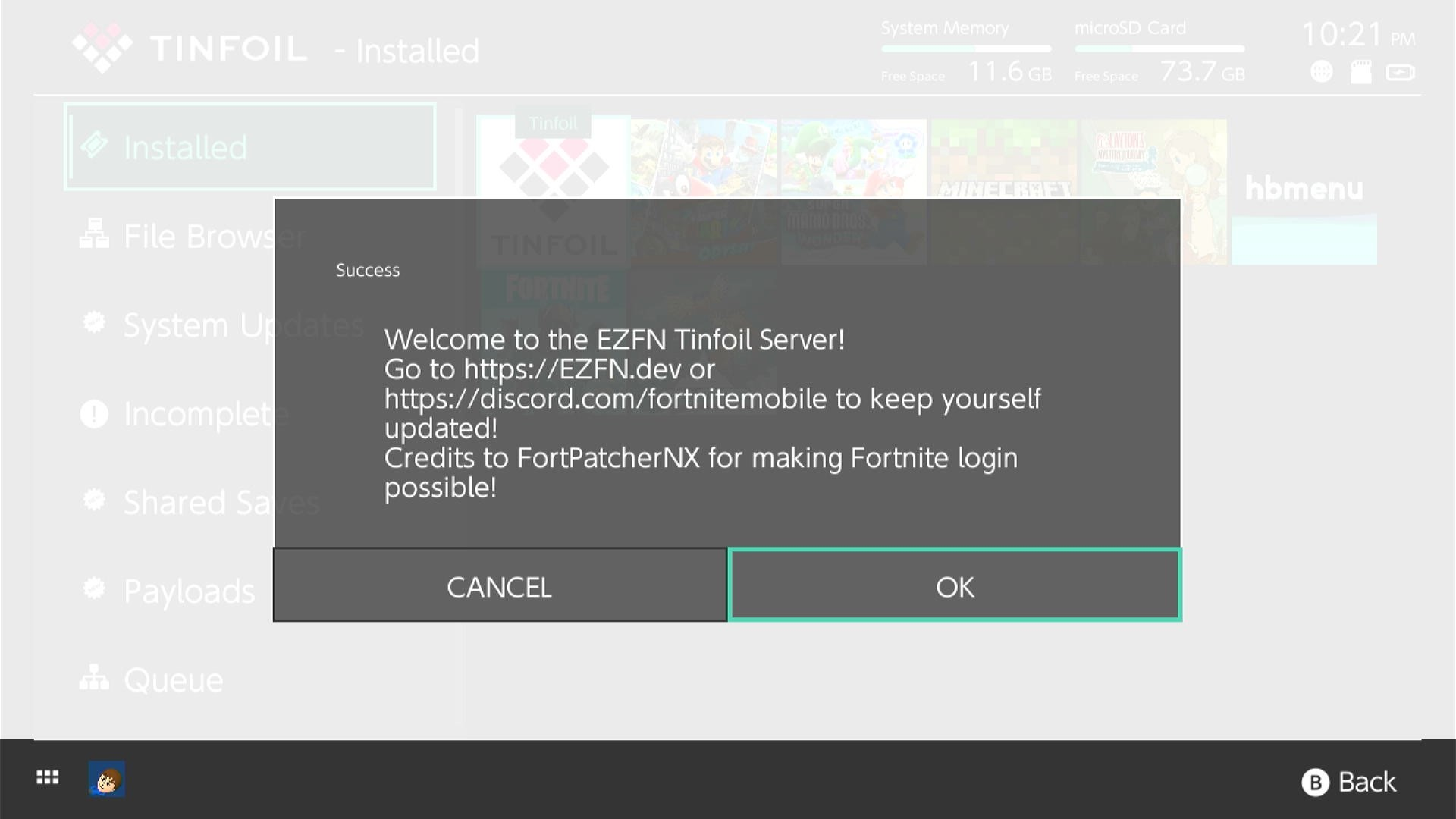 If everything goes correctly, Tinfoil should open and you will be able to see the EZFN Tinfoil server’s welcome message.